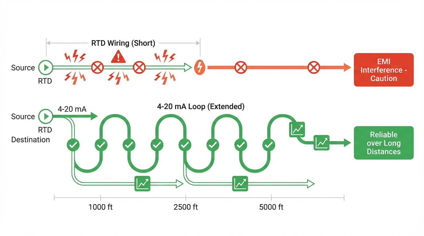 Prelectronics outlines two practical locations for conversion: at the sensor and in the panel. Mounting a transmitter on the RTD head or in a nearby junction box keeps RTD lead lengths very short, which minimizes their exposure to EMI and removes the need to run delicate sensor wiring through cable trays or across building structures. From that point forward, you enjoy the robustness of a 4-20 mA loop.