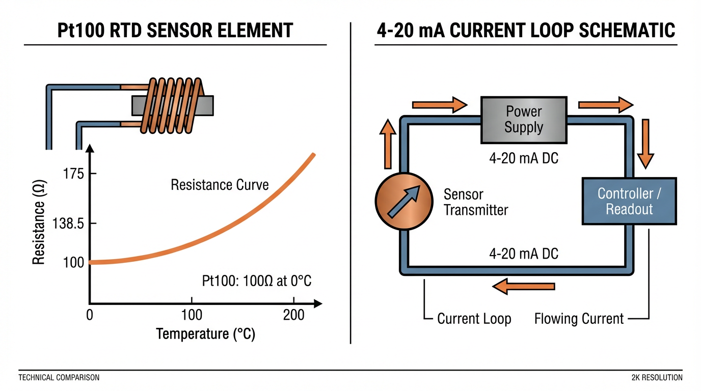 On the sensing side, you typically have a Pt100 RTD element. As Andivi explains, this is a platinum resistor that measures 100 Ohm at 0 °C, with resistance increasing in a predictable way as temperature rises. Industrial Pt100 probes are commonly built for ranges on the order of about -58 to 752 °F, depending on sensor class and construction.
