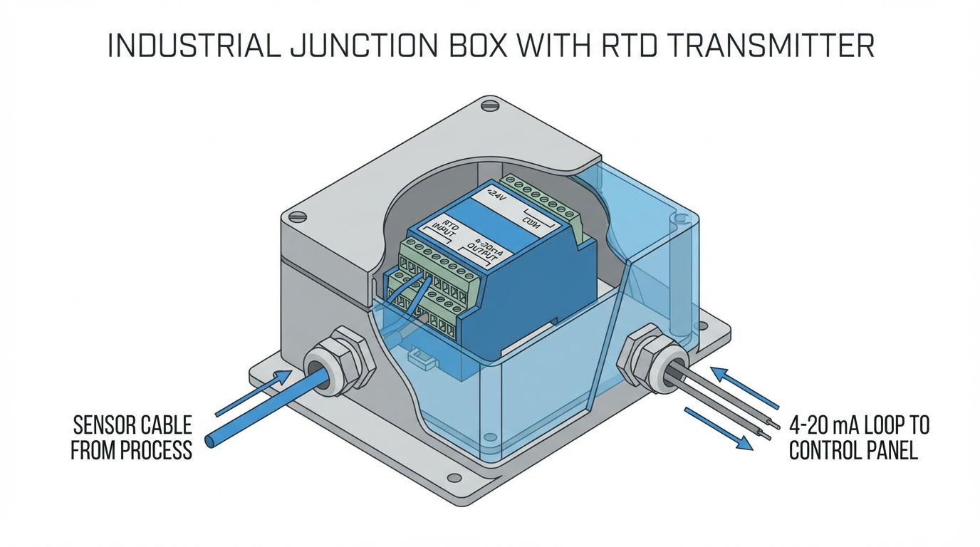 An RTD probe leaves the process and terminates either in a head‑mount transmitter on the sensor body, or in a remote DIN‑rail module in a nearby junction box or control panel. That transmitter drives a two‑wire or three‑wire 4-20 mA loop back to PLC analog input cards, panel displays, or both.