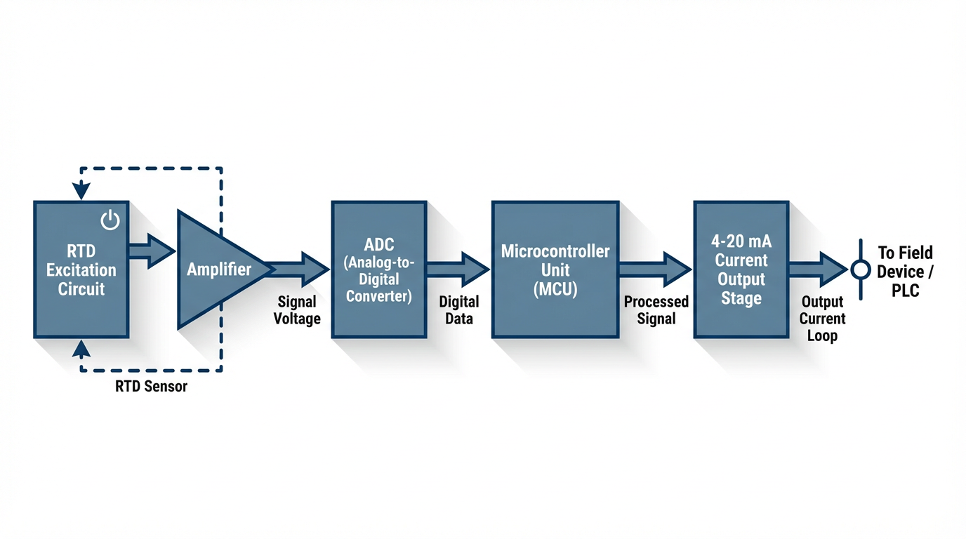 In a typical module, a constant, very small excitation current flows through the RTD element, and the resulting voltage drop is measured by an internal amplifier and analog‑to‑digital converter.