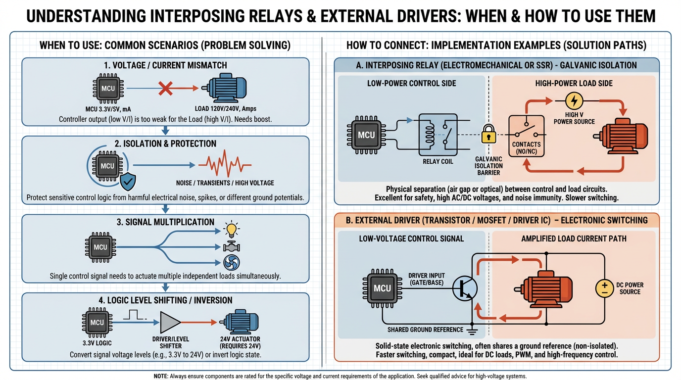 Interposing relays remain a core tool in the integrator’s kit, despite the availability of high‑current solid‑state modules. PLCDesign describes interposing relays as a way to electrically isolate cabinets from field devices, adapt to different field voltages, handle high‑current loads, fan out one PLC output to several field elements, or provide voltage‑free contacts. The cost of each extra relay is more than just hardware; each relay is another failure point that must be considered in availability calculations, especially in redundant systems.