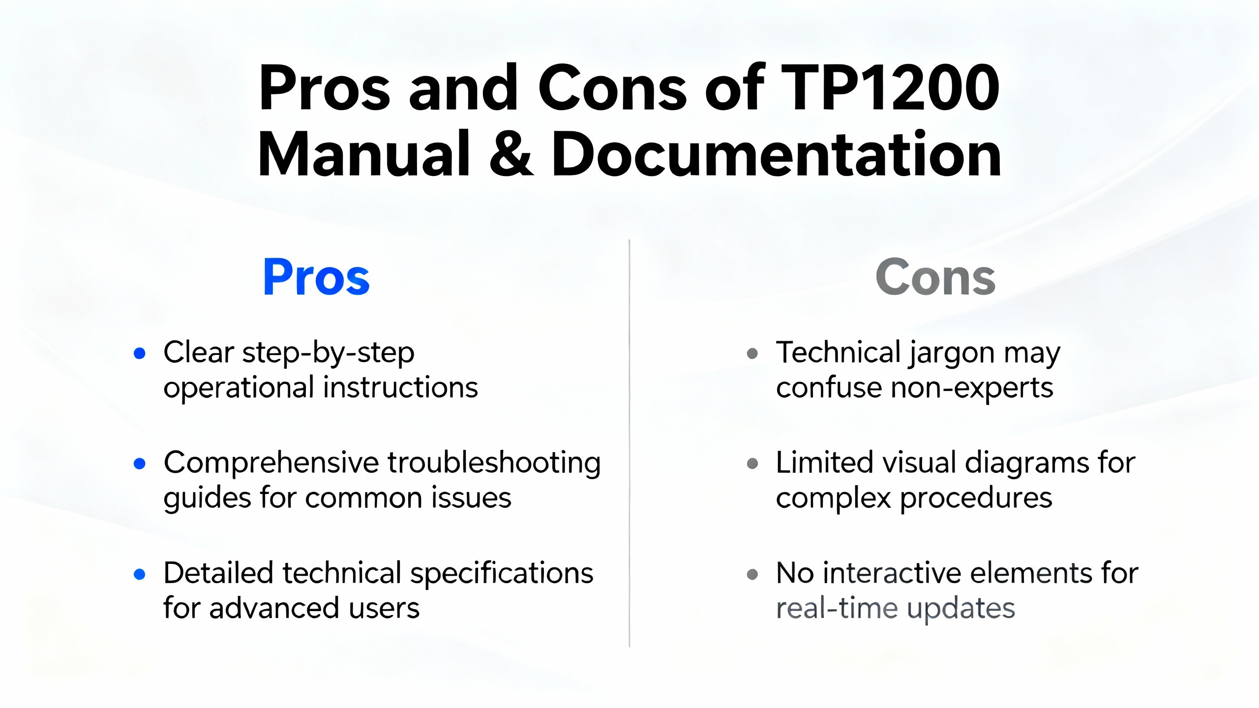 There are also limitations. Because the manual has to cover many devices, TP1200-specific information sometimes hides among generic text. If you treat every example as model-specific, you risk applying a parameter or limitation from a different panel to your own. It takes deliberate reading to cross‑reference the general chapters with the TP1200-specific drawings and tables.