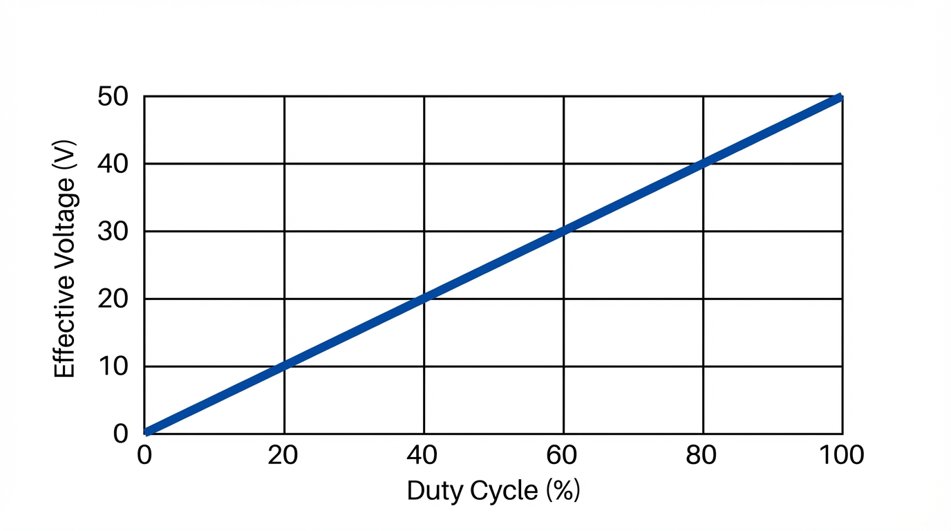 For DC motors, the arithmetic is the same, just much faster. Several sources, including Control.com and an educational article hosted by AI Future School, highlight the relationship: the average voltage equals duty cycle multiplied by the supply voltage. At 60% duty on a 12 V bus, the motor effectively sees about 7.2 V. WPILib documentation for educational robots explains it the same way using a 12 V motor: a 50% duty PWM drive feels like roughly 6 V.