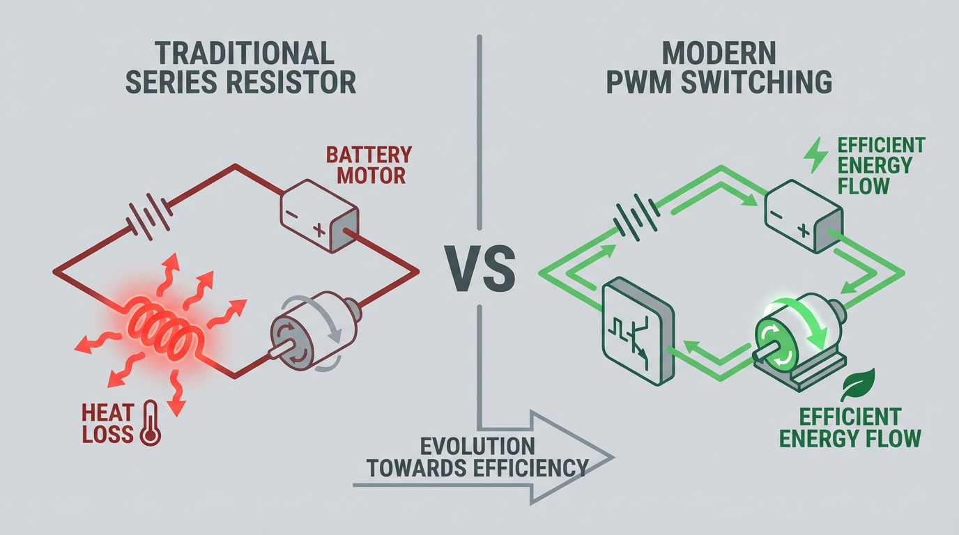 Modern speed control is almost always pulse width modulation. A Control.com technical article describes the core idea clearly: instead of lowering supply voltage, you switch the motor’s rated voltage on and off rapidly and vary the on-time percentage. A 12 V drive at 50% duty behaves like roughly 6 V on average, but the motor still sees full 12 V during each pulse. That lets you keep torque and avoid wasting power in rheostats or series resistors that simply burn energy as heat.