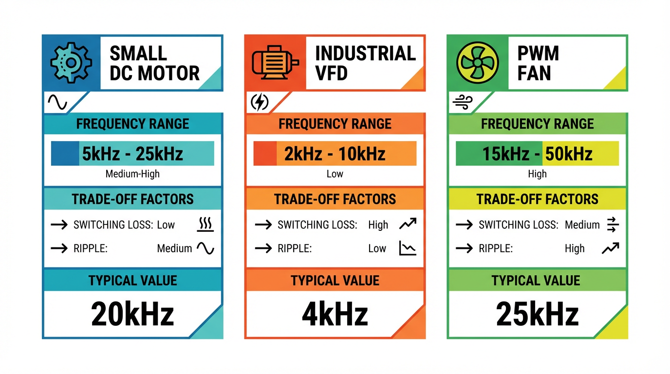 Control.com notes that slow loads such as heaters and some motors will tolerate PWM frequencies in the tens to hundreds of hertz, while LEDs and other solid-state loads often need frequencies in the tens of kilohertz to keep flicker and mechanical chatter away. Tektronix’s application note on PWM motor drives shows that industrial variable frequency drives often use carrier frequencies roughly from 2 kHz to 10 kHz, with some newer drives pushing above about 18 kHz to move noise out of the audible range.