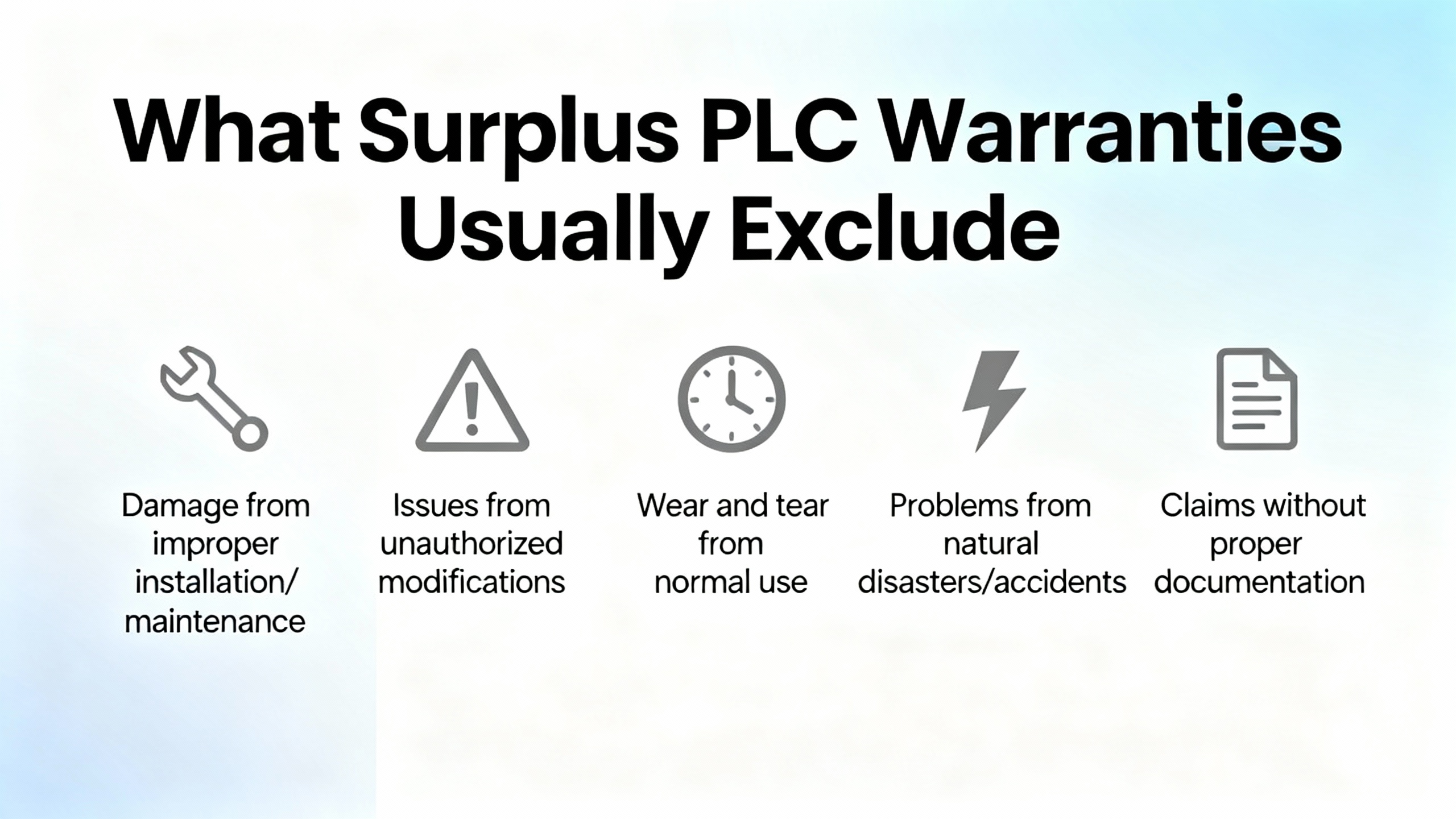 The real story is in the exclusions. Surplus PLC warranty pages devote far more space to what is not covered than to what is. PLCpartssolution and plcpartsstore both publish detailed lists that are representative of the industry.