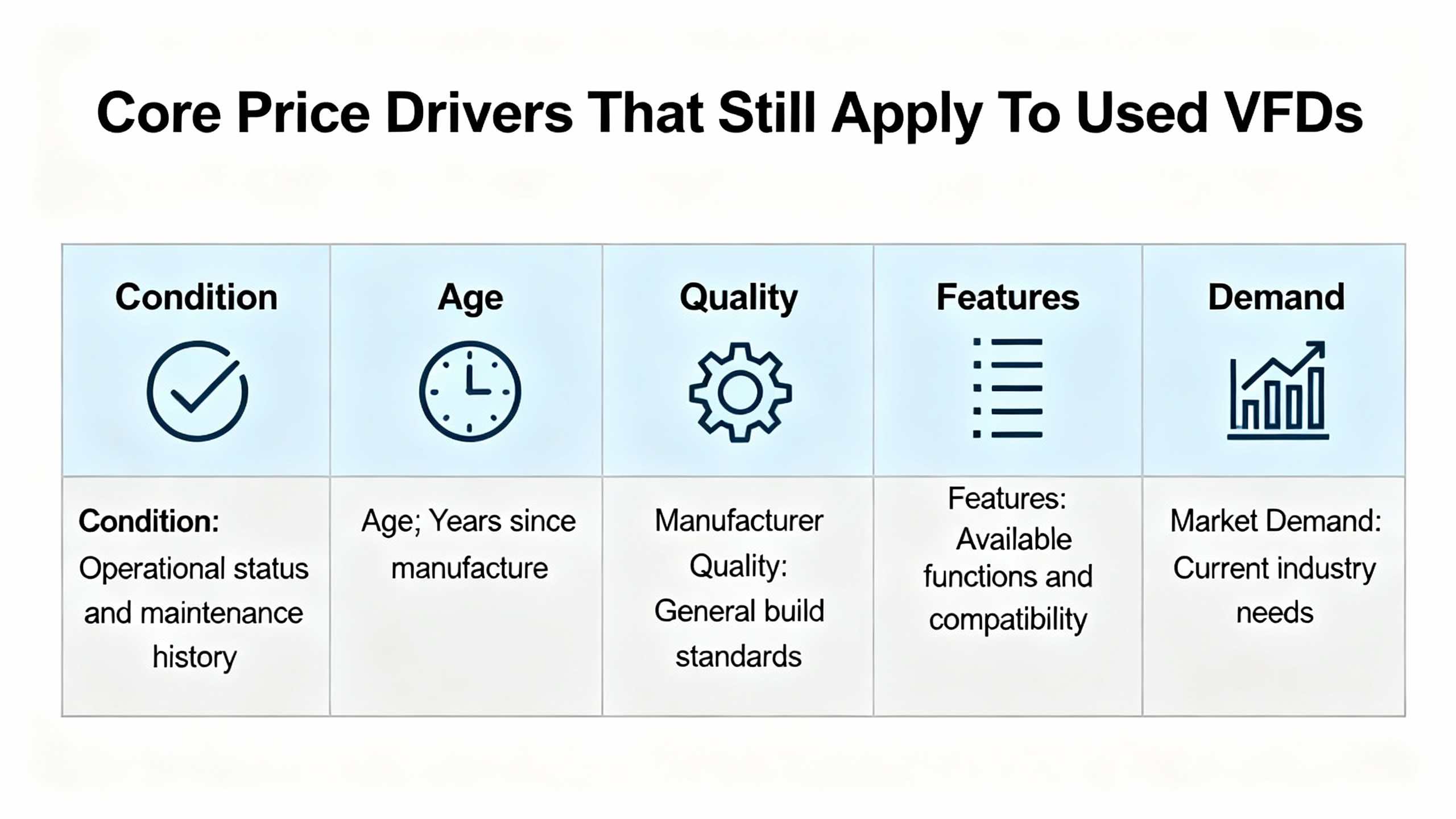 Everything that drives the price of a new VFD still matters when that drive is used or surplus. The difference is that you also have to factor in age, condition, and the credibility of the refurbisher.
