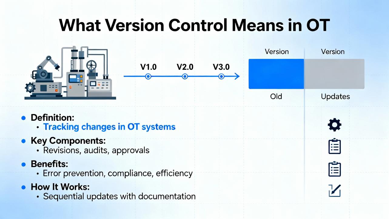 In industrial automation, version control is not just about code. It is a systematic approach to managing changes across automation assets, including PLC programs, HMI projects, device settings, firmware versions, and sometimes the operating data that explains how a line behaved at a point in time. AMDT frames version control in industrial systems as logging every device setting, driver version, and operational datum so that teams can compare states, undo changes, and recover quickly after an interruption. That description is aligned with what seasoned controls teams do in practice: they keep both the program history and the machine’s known-good state within arm’s reach.