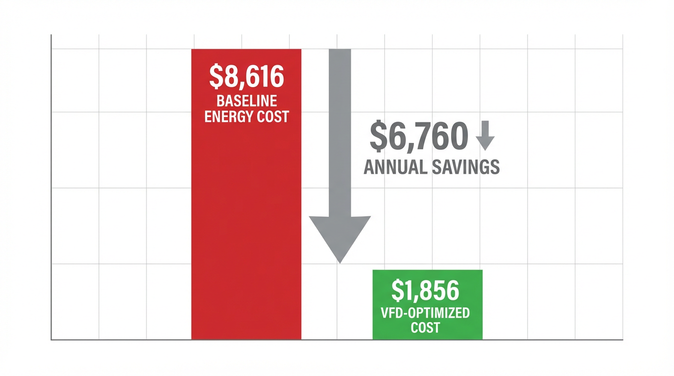 After installing the VFD, you log the same variables and derive new power-versus-load relationships. For variable-torque loads, baseline power might vary roughly linearly with flow under throttling, while VFD power varies more like the cube of speed. Combine the two sets of curves with measured or estimated distributions of load and operating hours over a year. The difference in annual kWh, multiplied by your blended electricity rate, is the annual dollar savings.