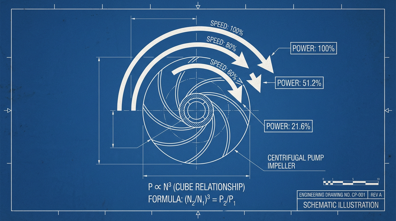 For centrifugal pumps and fans, the affinity laws tell us that power varies roughly with the cube of shaft speed.